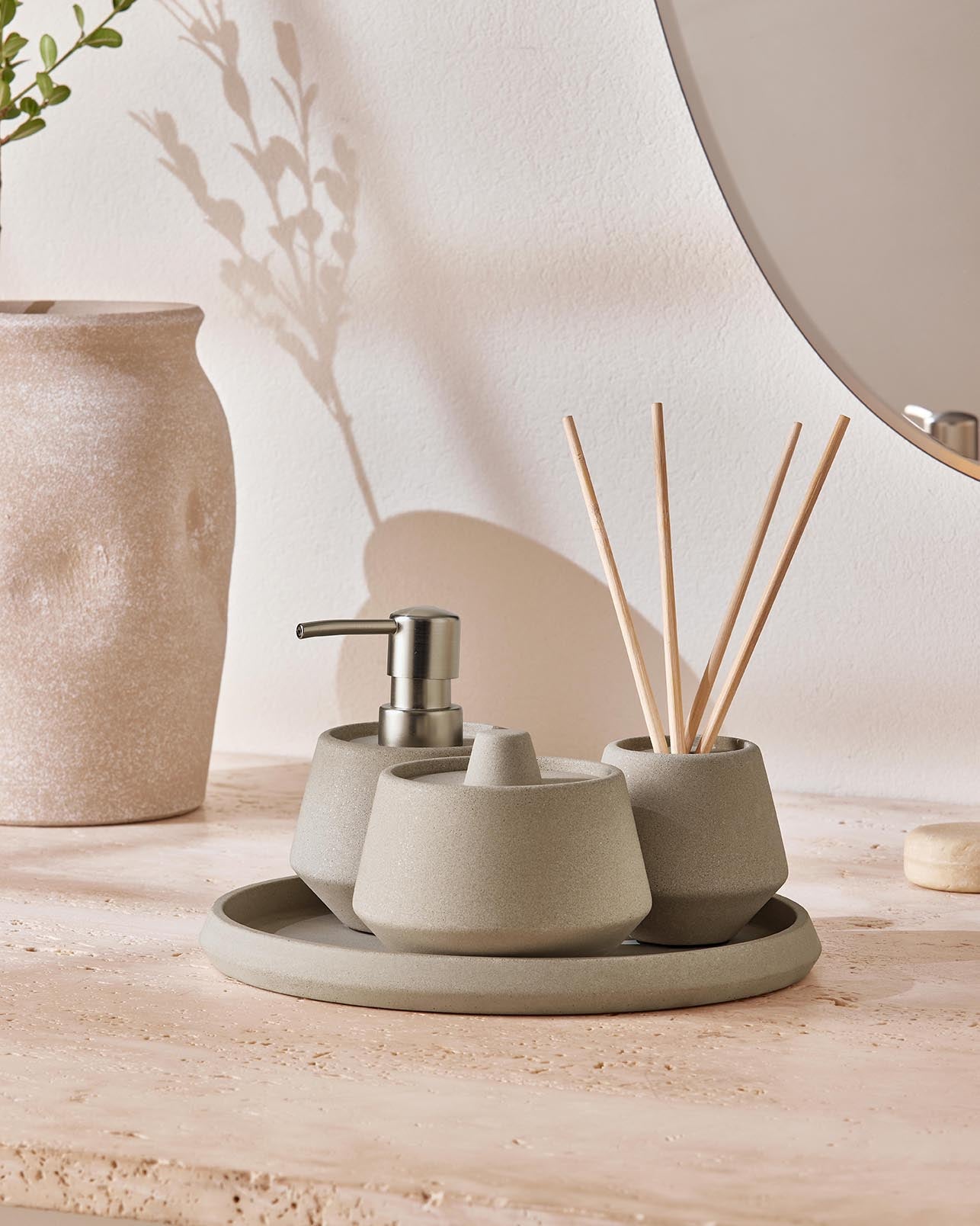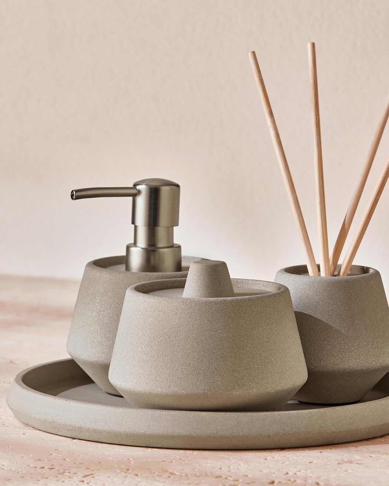 A textura tátil e a solidez de cada item proporcionam uma experiência sensorial única, elevando a sua rotina de cuidados pessoais. O design clean e a cor neutra do cimento criam uma base visual calma e organizada, permitindo que você adicione toques de cor com toalhas, plantas ou outros acessórios decorativos.